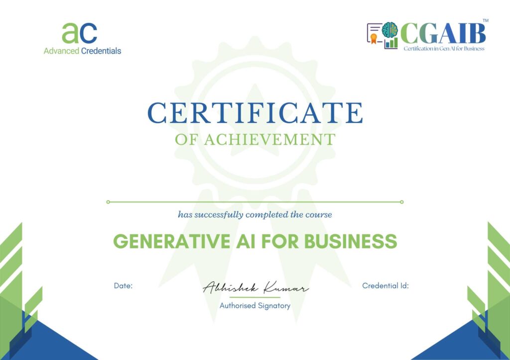 Graduates earn the Certified Generative AI in Business (CGAIB) credential, which is blockchain-verified by Advanced Credentials and validated by Mercer Mettl — making it credible and globally recognized.
